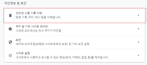2. 개인정보 및 보안 > 인터넷 사용 기록 삭제 클릭