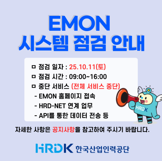 1. 작업기간 : 2025년 10월 11일(토) 09:00~16:00(예정) 2. 작업내용 : 산업인력공단 시스템 작업 3. 작업영향 : EMON 및 API 홈페이지 접속 불가, HRD-Net 행정지원시스템과 연계된 행정업무, API를 통한 훈련생 데이터 전송, 휴대폰 본인인증 결과 실시간 전송, 만족도 조사, mOTP 인증 4. 당부사항 : 해당 기간내 mOTP 인증이 불가하므로 휴대폰 본인인증을 활용해주시길 바라며, 만족도 조사는 해당시간 이후에 진행을 부탁드립니다.