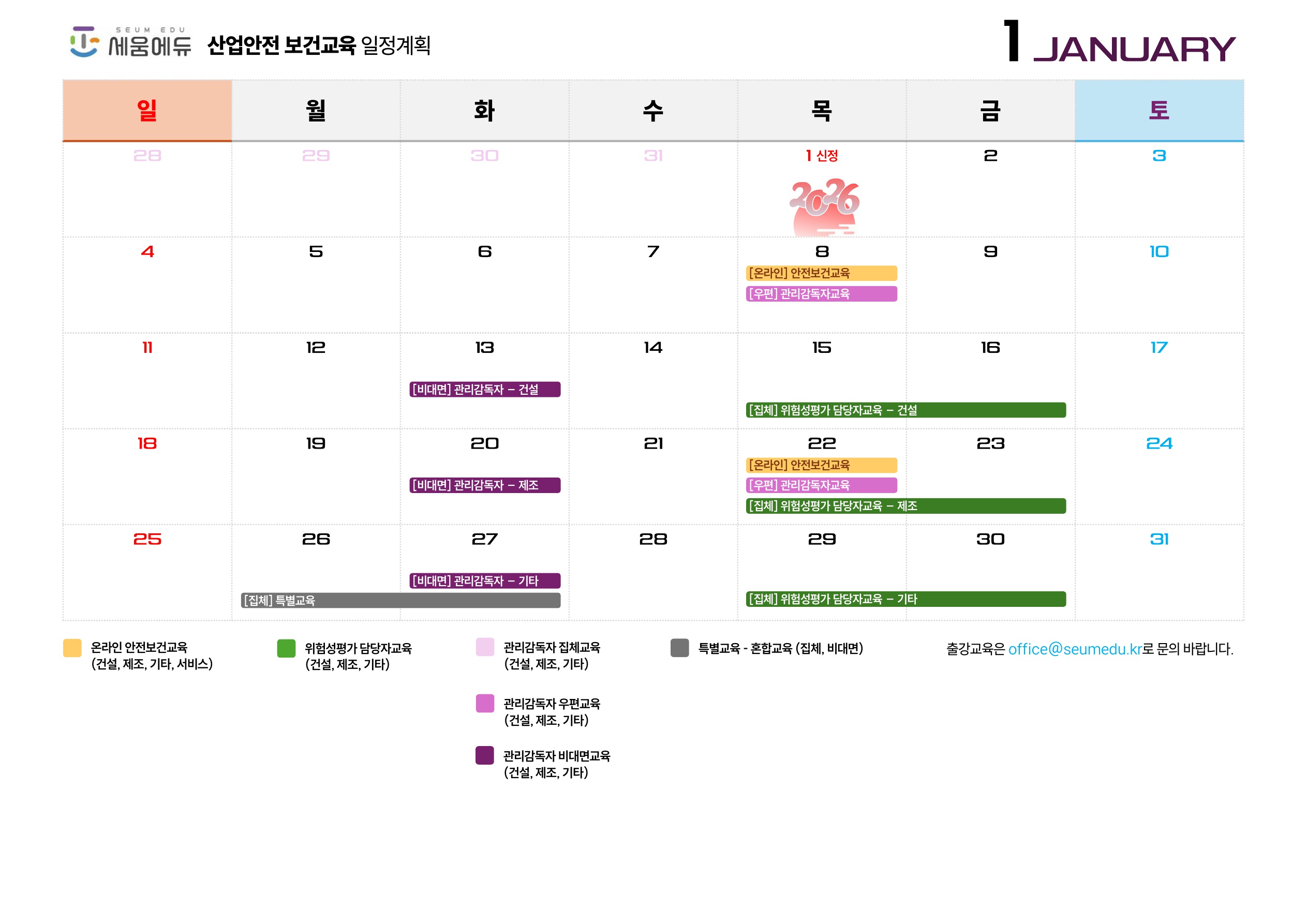 2026년 1월 진행가능한 온라인/집체/비대면 근로자, 관리감독자, 위험성평가 담당자 등 산업안전보건교육 계획을 아래와 같이 안내 합니다.