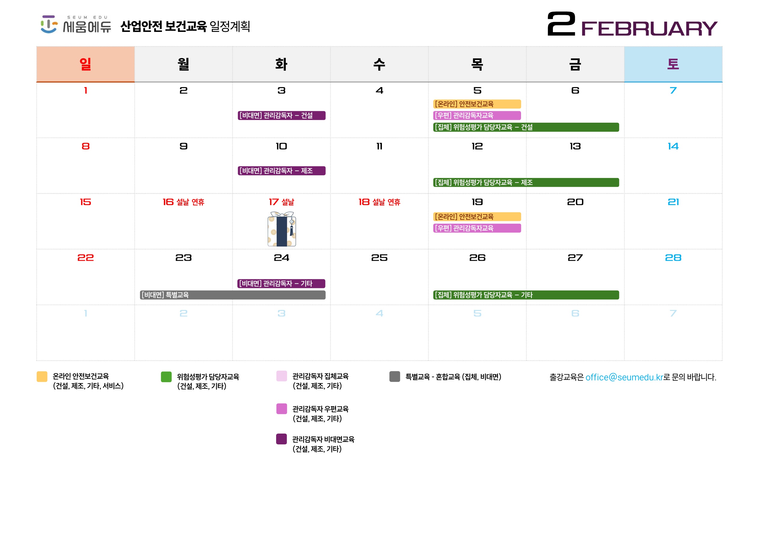 2026년 2월 진행가능한 온라인/집체/비대면 근로자, 관리감독자, 위험성평가 담당자 등 산업안전보건교육 계획을 아래와 같이 안내 합니다. 교육일정은 업체의 사정에 따라 조율이 가능 합니다. 자세한 문의사항은 1833-3075로 문의주시기 바랍니다. 온라인 산업안전보건교육은 최신(2025.12.기준) 개정안이 적용된 콘텐츠로 제공이 됩니다. 화재폭발대피 교육 및 폭염, 한파 대처법 안전교육 등 최신 규정에 따른 내용이 모두 반영되어 있습니다. 그 외 직종별 특화과정이 더 추가되었습니다. 세움에듀는 자체 콘텐츠 개발능력을 보유하고 있으며, 최근 개정사항이 반영된 콘텐츠는 26년 2월부터 제공예정 입니다. 또한, 업종별 특화과정이 더 추가되었습니다.
